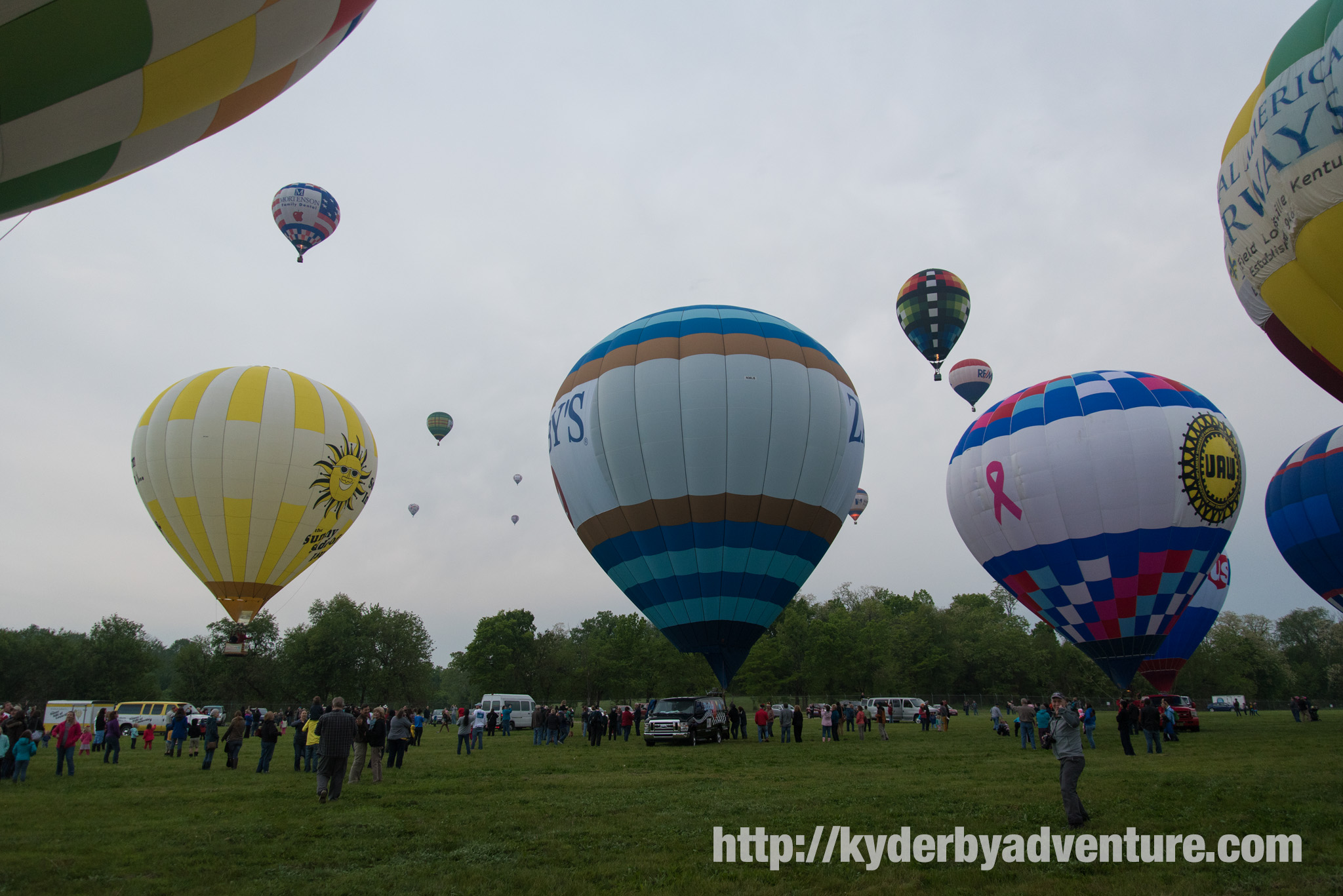 In the early days of the Kentucky Derby Festival it was one race. If weather messed you up in the morning, try again in the evening or try the next day. But now the Great Balloon Fest spans three days with both morning and evening events scheduled, hopefully the pilots can get in some of the events. Today, the weather held off and the Great Balloon Rush-Hour Race lifted off from Bowman Field on time to gray skies and a moody sunrise busting through the layered clouds.